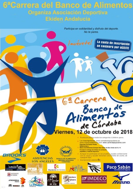 6ª Carrera Popular La CORDOBARIA 2018 a favor del Banco de Alimentos de Córdoba. Se celebrará el viernes 12 de octubre de 2018 en Córdoba a partir de las 10:00 h. Estará organizada por la Asociación deportiva Ekiden Andalucía con la colaboración del Banco de Alimentos Medina Azahara de Córdoba. La salida y meta será desde el Balcón del Guadalquivir.