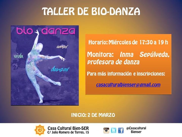 Tras la sesión gratuita de demostración del pasado jueves 28 de enero, en la Casa Cultural Bien-SER se ofertará un taller de BIO-DANZA para los miércoles de 17:30 a 19 h, con inicio previsto el miércoles 2 de marzo. Monitora: Inma Sepúlveda (profesora de danza). Más información sobre el taller e inscripciones: casaculturalbienser@gmail.com.