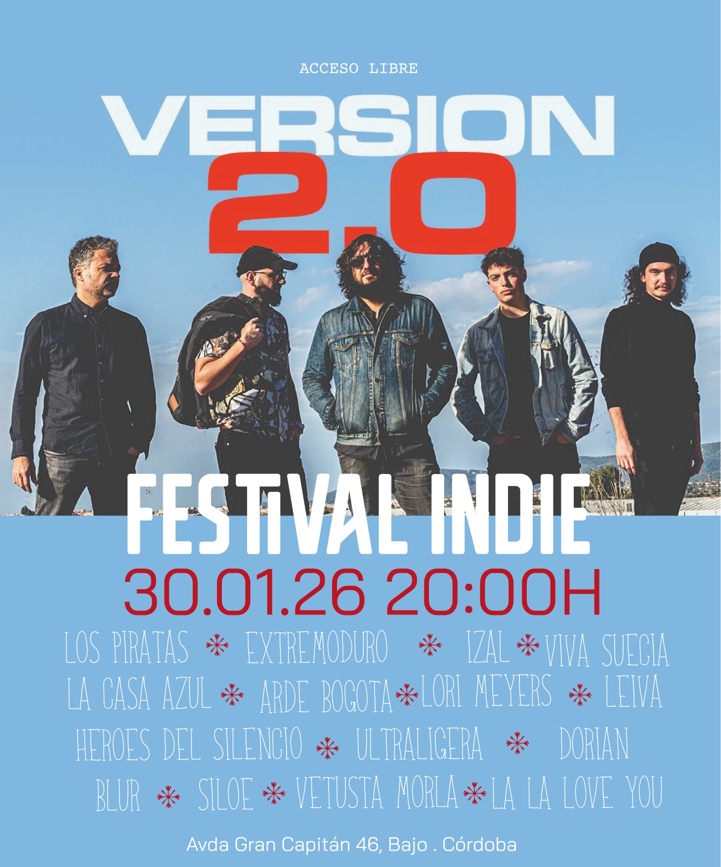 La banda de tributo Versión 2.0 con lo mejor del INDIE-ROCK alternativo, interpretan temazos de Los Piratas, Extremoduro, The Strokes, Franz Ferdinand, Vetusta Morla, Izal, Love of Lesbian, Leiva, Sidonie, Los planetas, Supersubmarina, Lori Meyers, La Casa Azul, Dani Fernández, El canto del loco, Two Door Cinema Club entre otros, en un espectáculo cargado de emoción e interacción con el público.