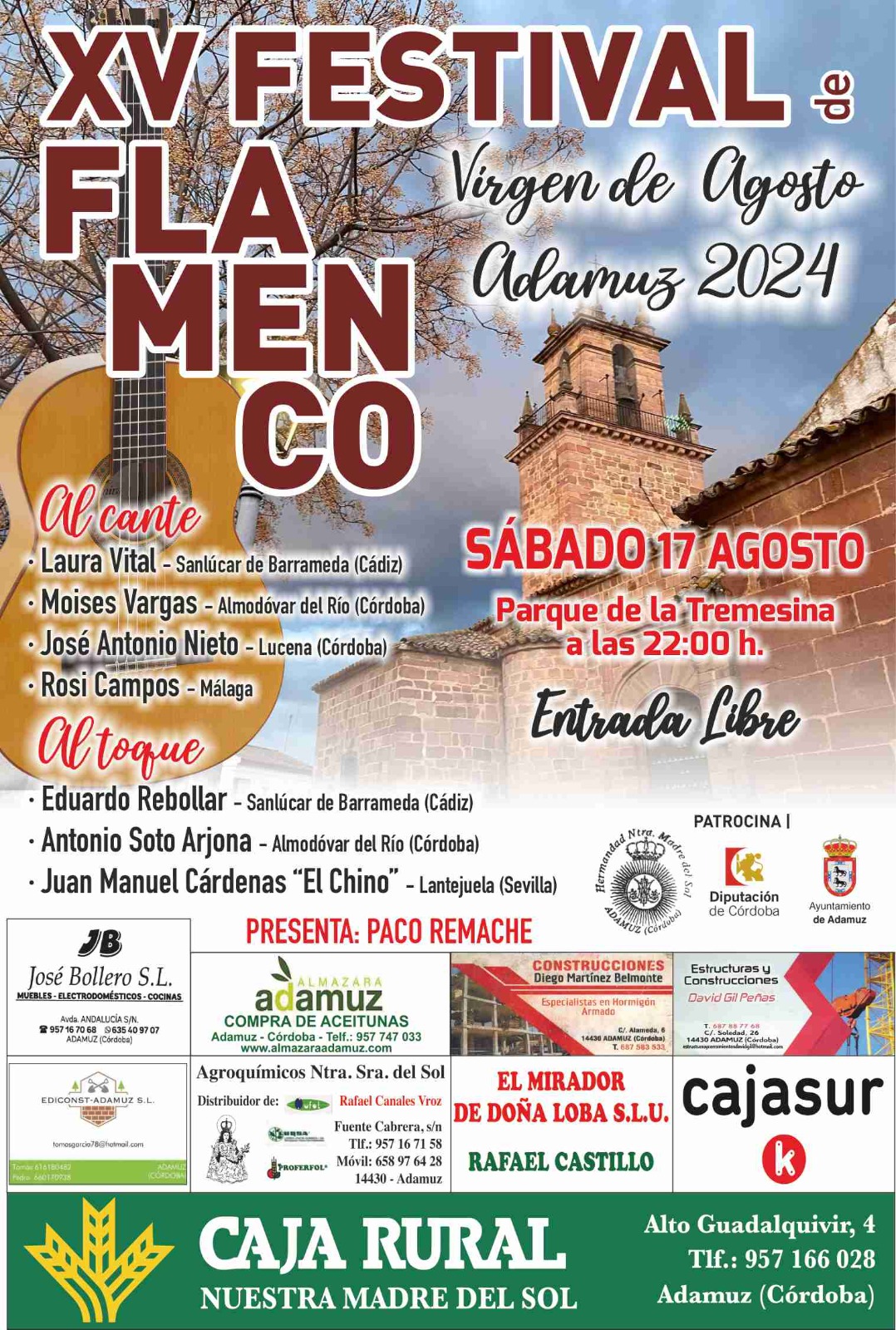 La cantaora sanluqueña LAURA VITAL actuará en la localidad cordobesa de Adamuz. La actuación forma parte del XV Festival Flamenco Virgen de Agosto . Llevándose a cabo el 17 de Agosto de 2024. Dando comienzo el acto a las 22.00h La entrada será libre para todos los públicos. A la guitarra estará el guitarrista Eduardo Rebollar . Organiza. Excmo. Ayto de Adamuz. Patrocina. Hdad Ntra Madre del Sol y Excma. Diputación de Córdoba. El evento se celebrará en el Parque de la Tremesina.