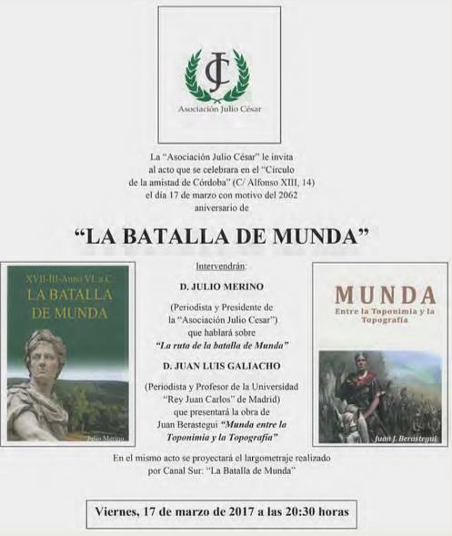 Intervendrán: Julio Merino, periodista y presidente de la Asociación Julio César que hablará sobre «La ruta de la batalla de Munda» y Juan Luis Galiacho, periodista y profesor de la Universidad Rey Juan Carlos de Madrid que presentará la obra de Juan Berasategui «Munda entre la Toponimia y la Topografía».