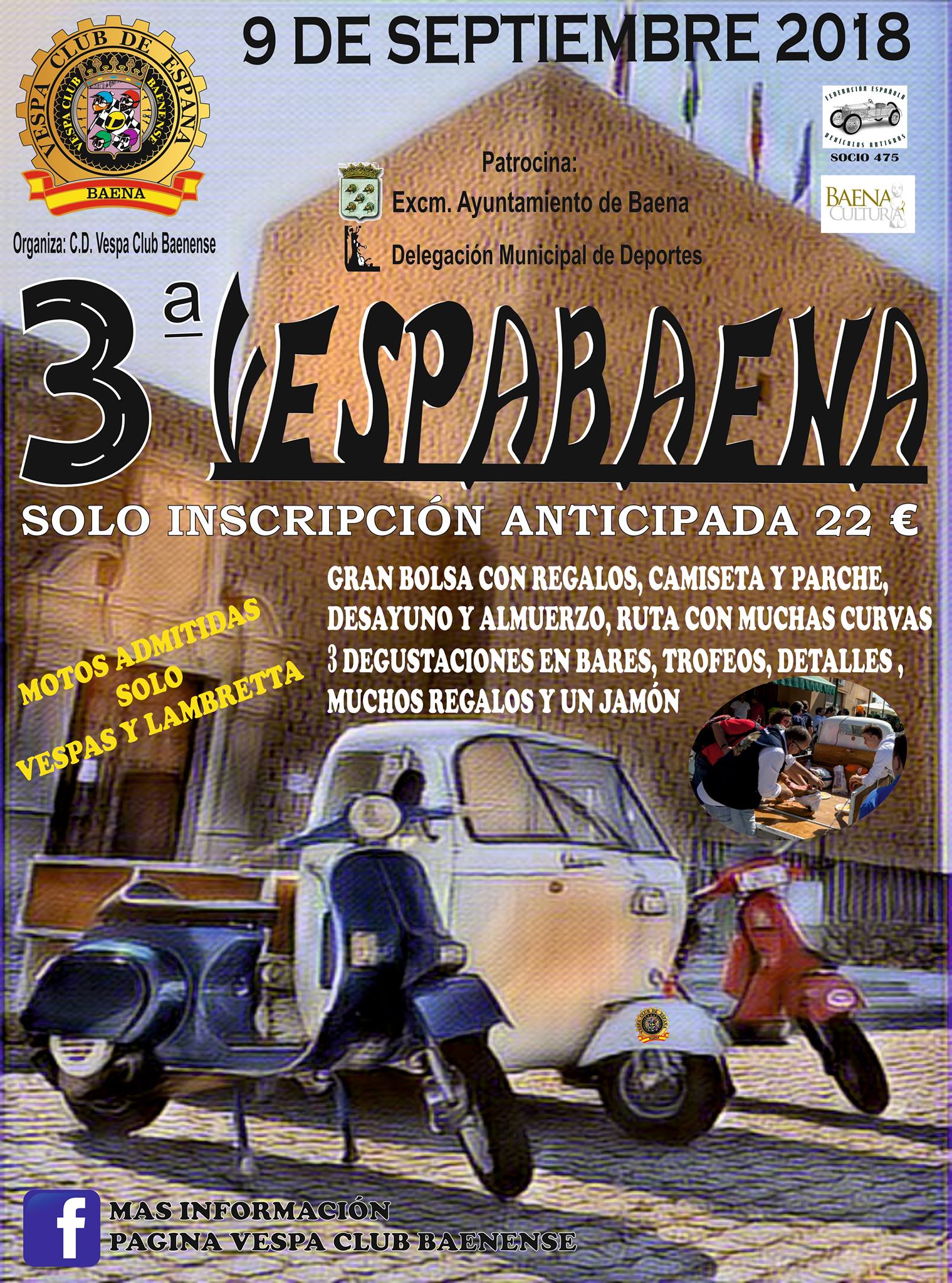 Quedan abiertas las inscripciones desde hoy hasta el 4 de Septiembre de 2018, para nuestra Ruta del 9 de Septiembre de 2018 (3ª VESPABAENA) que celebraremos en Baena, animaros a participar en este evento que hemos preparado para que disfrutéis de un buen día de convivencia entre vésperos dándoos a conocer nuestro pueblo y con una ruta muy atractiva por la Subbética Cordobesa visitando los pueblos de Luque, El Esparragal, Zagrilla la Baja y Albendin (Agarrarse que vienen curvas), con varias degustaciones, además de una buena bolsa con regalos, camiseta y un espectacular parche , participar en el sorteo de Regalos y optar a los trofeos. Desayuno y Almuerzo todo por tan solo 22 €. Sin olvidarnos de un jamón que compartiremos con todos los participantes a lo largo de la ruta.